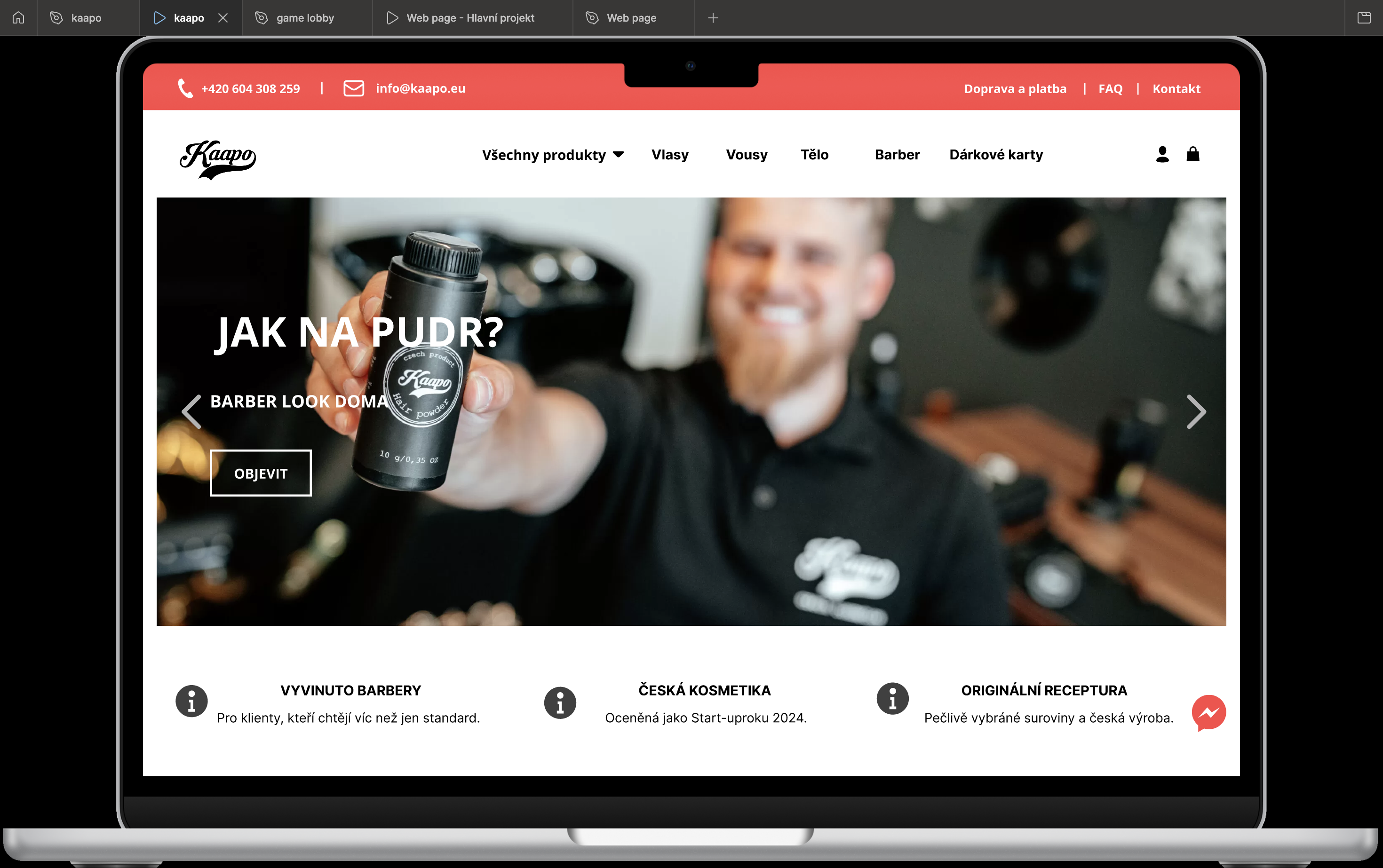 náhled e-shopové stránky značky Kaapo zobrazený na displeji notebooku. Hlavní banner ukazuje barbera držícího stylingový pudr s velkým nápisem „JAK NA PUDR?“.