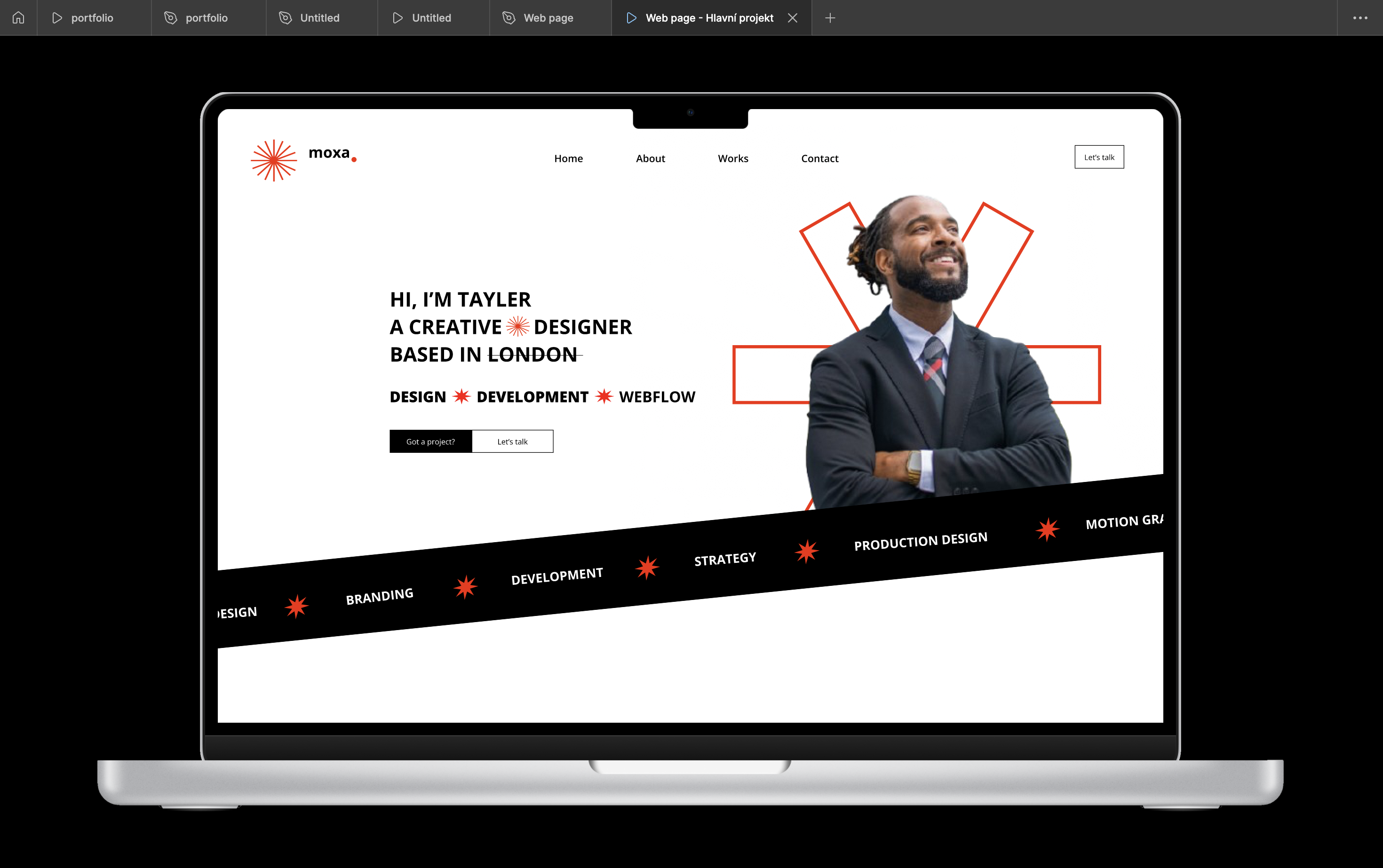 Je to ukázka moderní webové homepage na obrazovce MacBooku – portfolio designéra s menu, textem a fotkou, které jsem vytvořil ve Figmě.